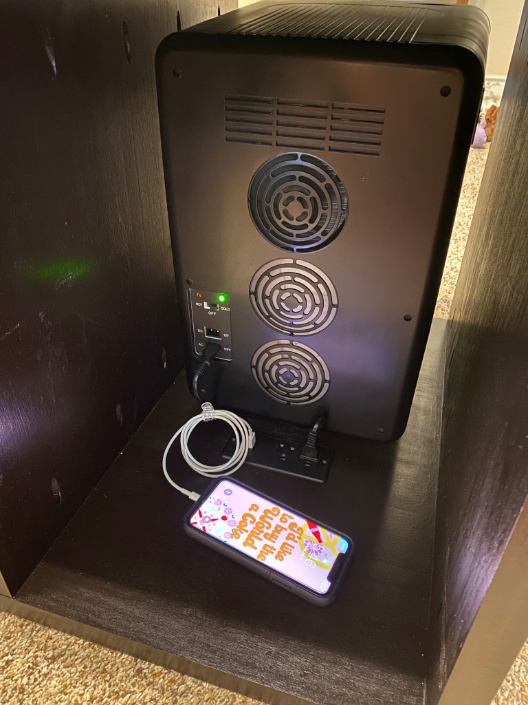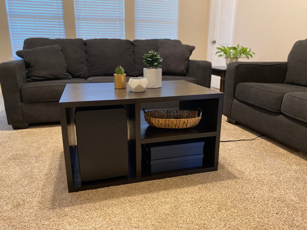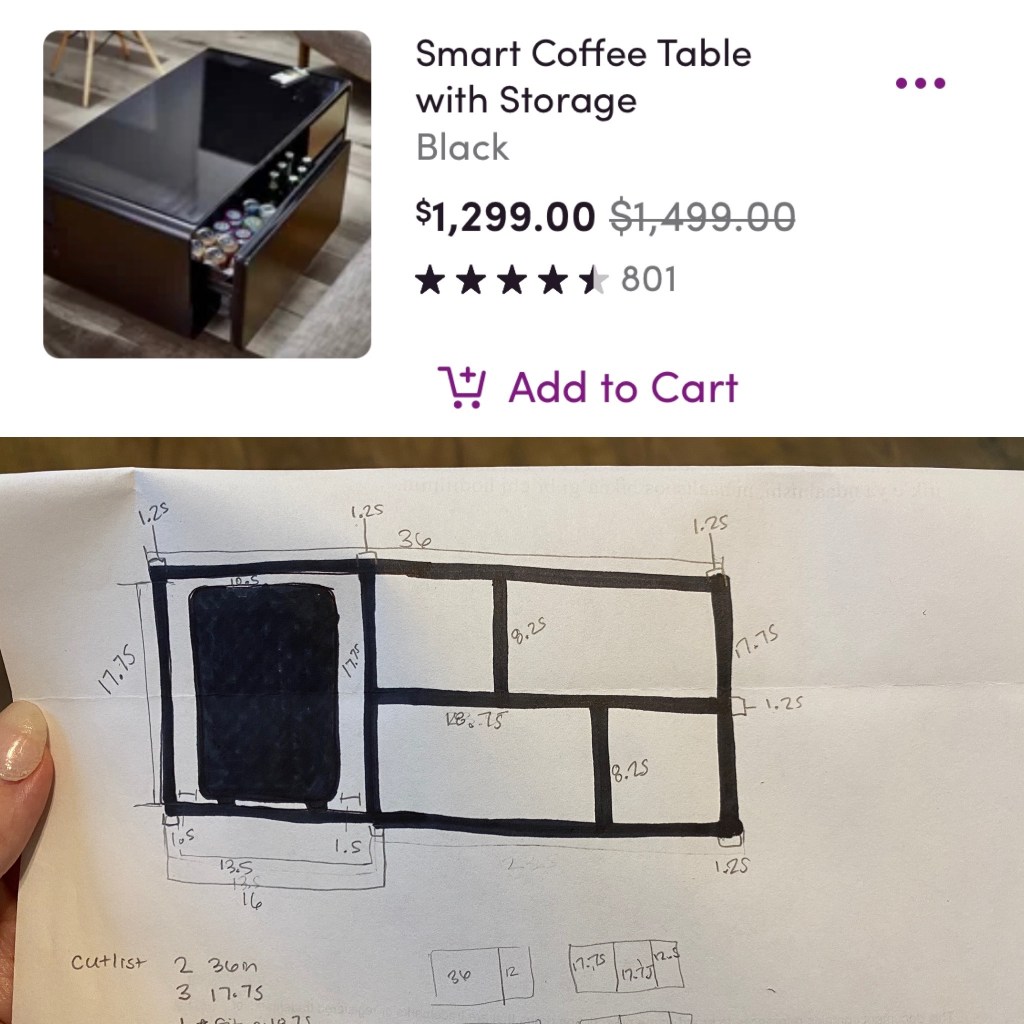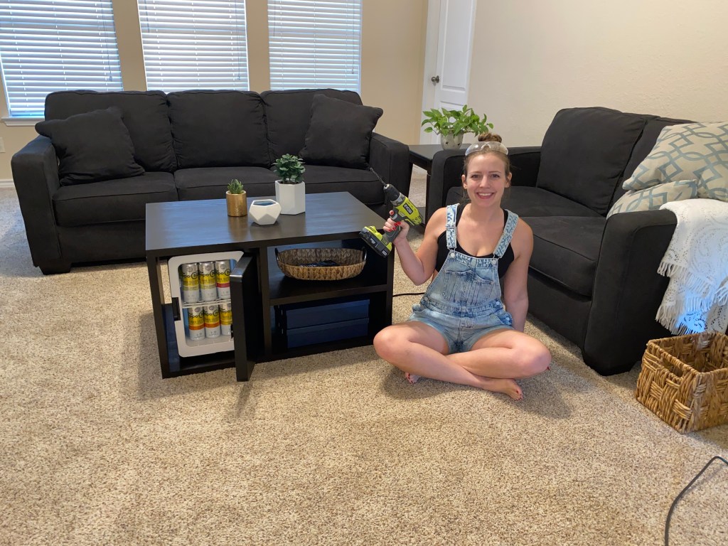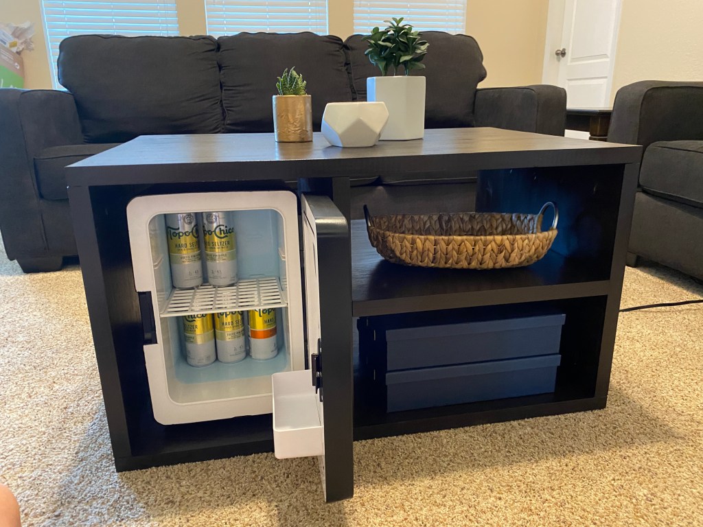 The inspiration was a $1,500 “smart” table with a built-in fridge and USB plugs for Matt’s game room. I set out to make a better-looking and cheaper version and at just $295, I think I succeeded!
